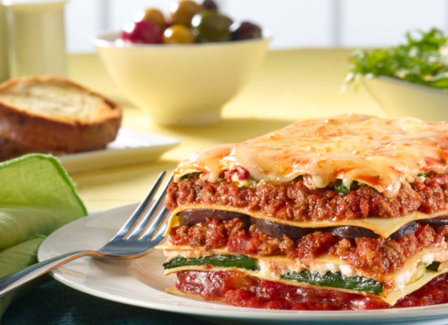 Tomate italienne, Fromage ricotta (lactosérum, lait, culture bactérienne, sel, acide citrique), Eau, Semoule de blé dur, Fromage mozzarella (lait, culture bactérienne, sel, enzyme microbienne), Fromage parmesan (lait, culture bactérienne, sel, lipase, enzyme microbienne), Aubergine, Oignon, Farine, Poivron rouge, Tomate séchée (contient sel), Oeuf entier liquide, Lait, Olives noires, Ail dans l’huile (ail, huile de canola, eau, acide citrique), Huile d’olive extra vierge, Vin blanc, Câpres (câpres, eau, sel, vinaigre), Sel, Sucre, Amidon de maïs modifié, Fines herbes, Épices.