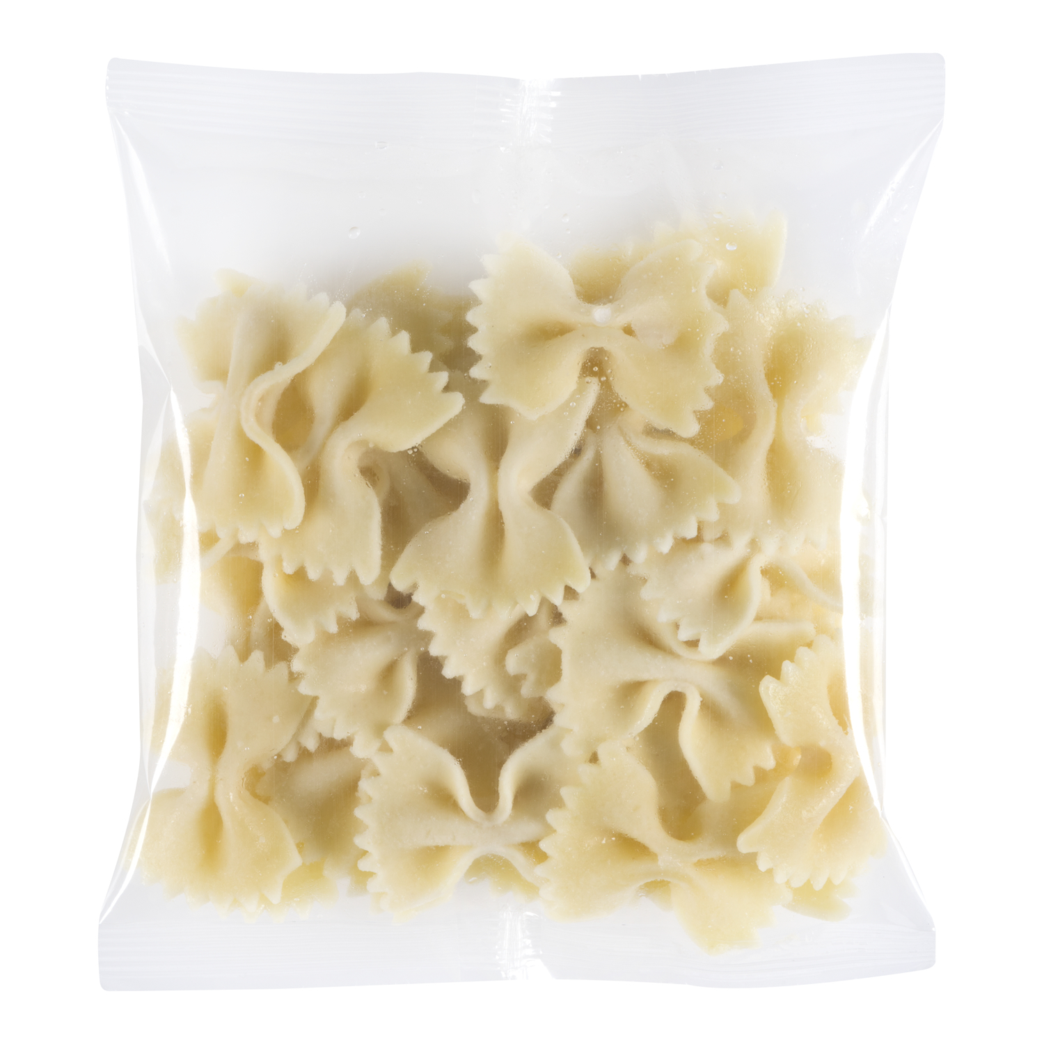 Bow shapped pasta is cooked al dente pasta and individually quick frozen and portioned. The pasta precooked and individually frozen and pre-portioned and ready from the freezer in minutes.