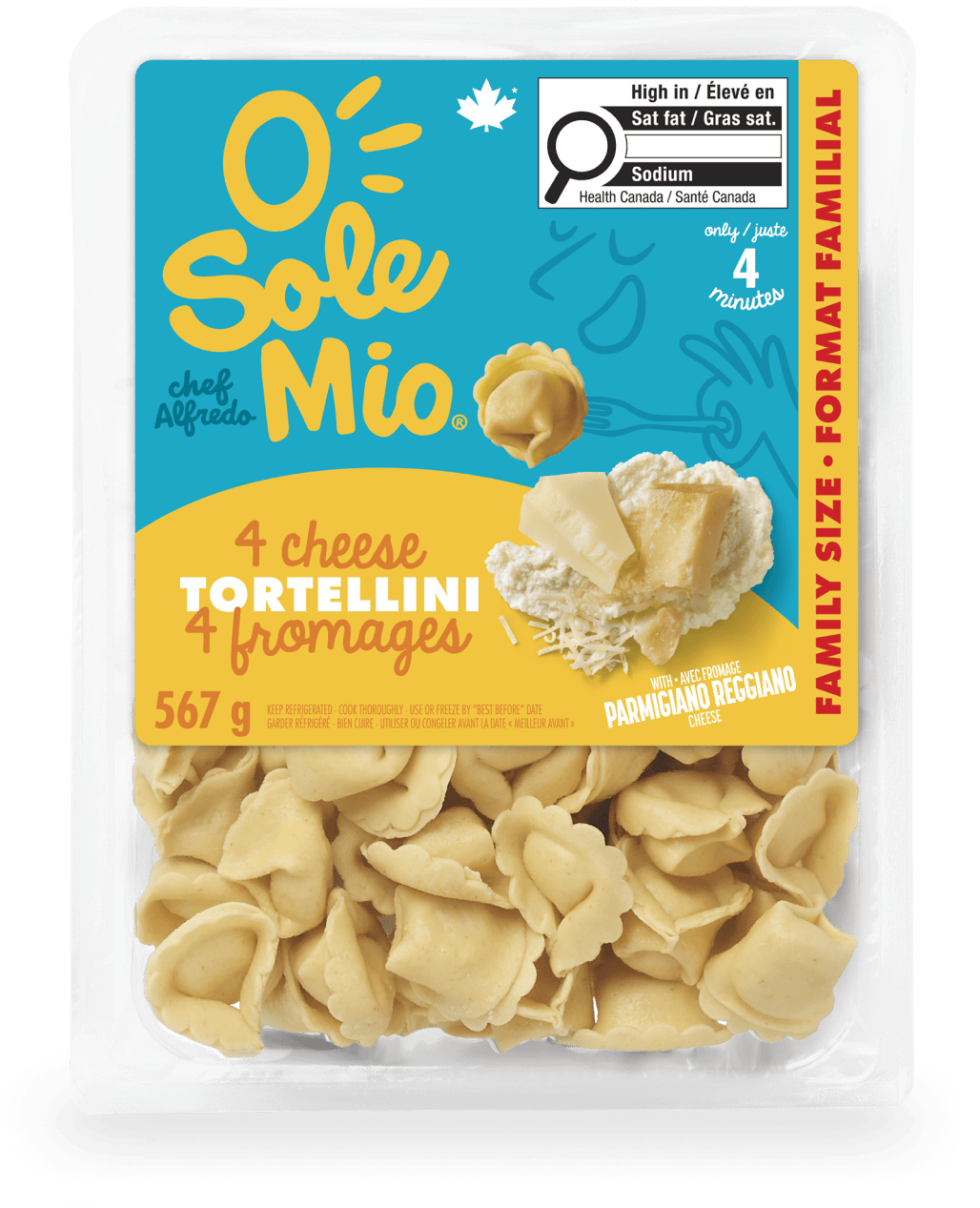 Pâte: Semoule de blé dur, Farine de blé, Eau, Oeuf entier liquide. Garniture : Ricotta fromage à pâte molle frais (lactosérum, lait, sel, acide citrique), Chapelure de blé grillée, Fromage parmesan (lait partiellement écrémé pasteurisé, culture bactérienne, sel, enzyme microbienne), Lait, Eau, Fromage à pâte dure affiné importé (lait, sel, enzyme microbienne, lysozyme), AOP Parmigiano reggiano fromage parmesan importé (lait de vache, sel, présure), Huile de canola, Fromage asiago râpé (lait, culture bactérienne, sel, lipase, enzyme microbienne, substances laitière modifiées), Lactosérum, Fromage romano modifié par enzyme, Préparation arômatisante de fromage (arôme naturel, eau, huile de tournesol, sel, poudre de lait écrémé), Sel, Farine de blé, Beurre, Amidon de maïs modifié, Huile de tournesol, Extrait de levure, Fromage parmesan (lait, culture bactérienne, sel, lipase, enzyme microbienne), Épices, Gomme xanthane.