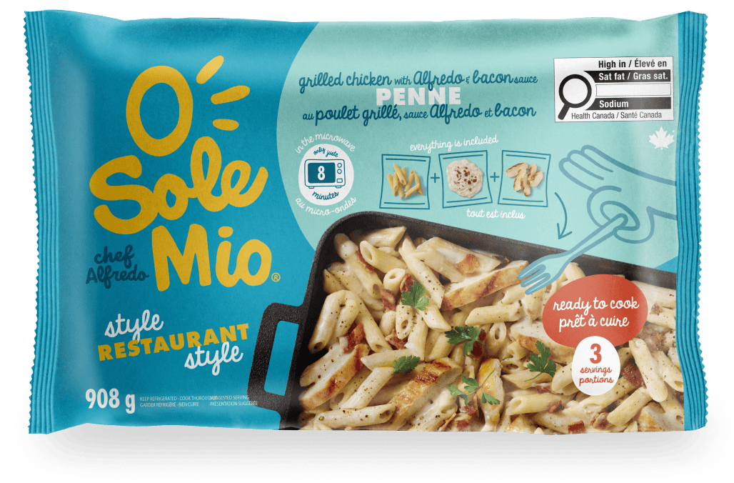 Sauce (lait, crème [lait, crème, citrate de sodium, phosphate de sodium, carraghénane, gomme de caroube], oignon, eau, bacon, fromage parmesan, beurre, huile d’olive extra vierge, ail, vin blanc [sulfites], amidon de maïs modifié, fines herbes, fromage romano modifié par enzyme, huile de canola, gomme xanthane, huile de tournesol, sel, épices), Pâtes (pâtes de semoule de blé dur, eau, huile de canola), Poitrine de poulet assaisonnée (poitrine de poulet, bouillon de poulet, fécule de pomme de terre, sel, poudre de vinaigre modifié, sucre, arôme naturel, extrait de levure, épices).